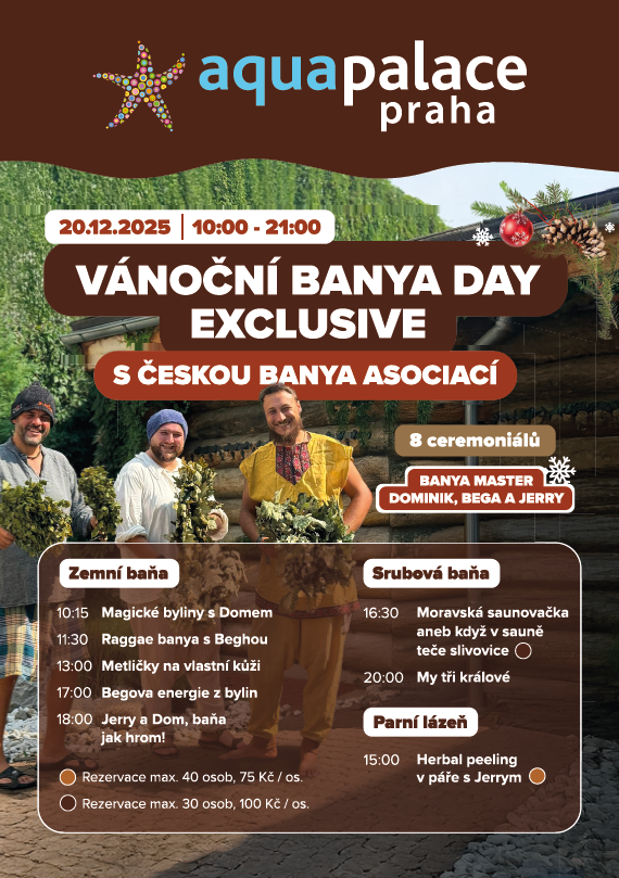 This year, we continue the popular Banya Days in the Sauna World of Aquapalace Praha. Our banya masters Dominik, Vojta, Verča, Bega, and Jerry will guide you through a world of relaxation and regeneration.