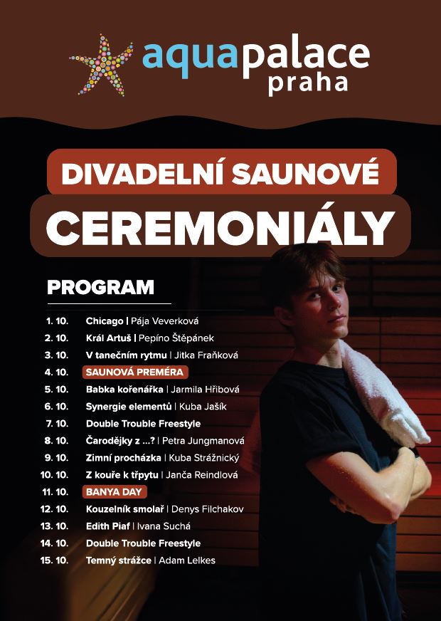 Každé představení je originální – od uvolňujících relaxačních ceremoniálů přes humorné scény až po napínavé příběhy s nečekaným koncem. Novinkou je také program saunování cestování inspirovaný tradicemi a místy z různých koutů světa. Saunéři si sami volí kostýmy, připravují scénáře a pečlivě vybírají hudbu, aby byl váš zážitek co nejintenzivnější. Každý měsíc navíc uvádíme novou divadelní premiéru, takže se program nikdy neomrzí a vždy vás čeká něco nového!