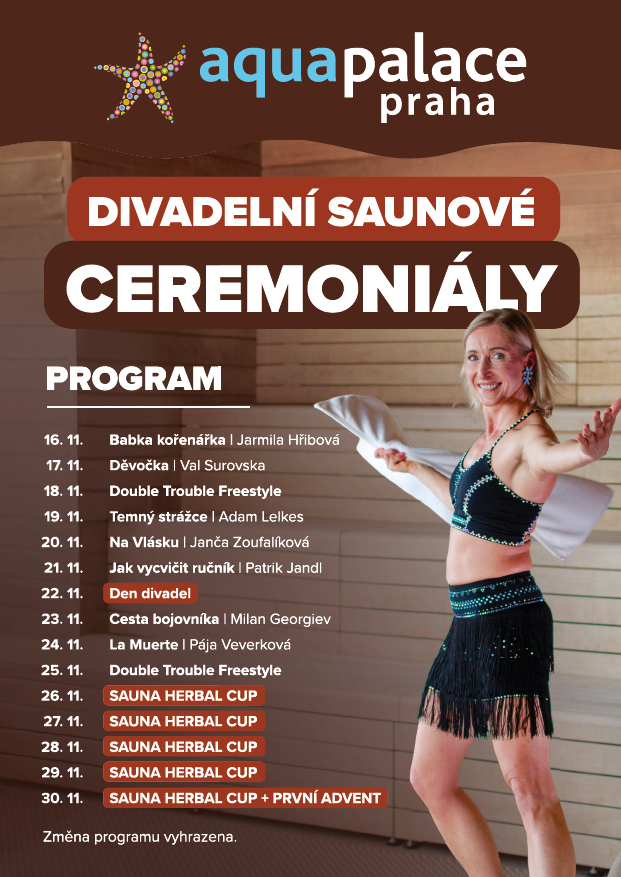 Divadelní ceremoniály se konají každý den od 20:00 hodin ve venkovní Srubové bani.
