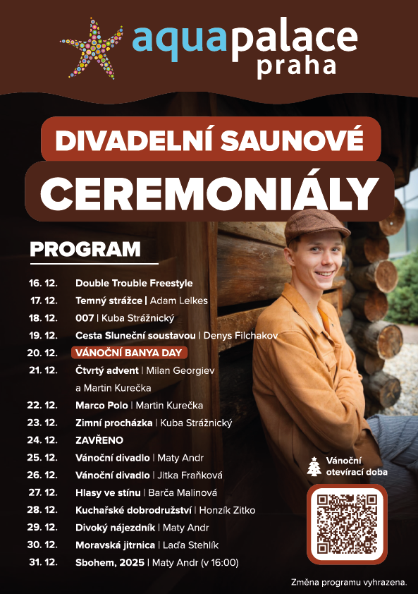 Divadelní ceremoniály se konají každý den od 20:00 hodin ve venkovní Srubové bani.